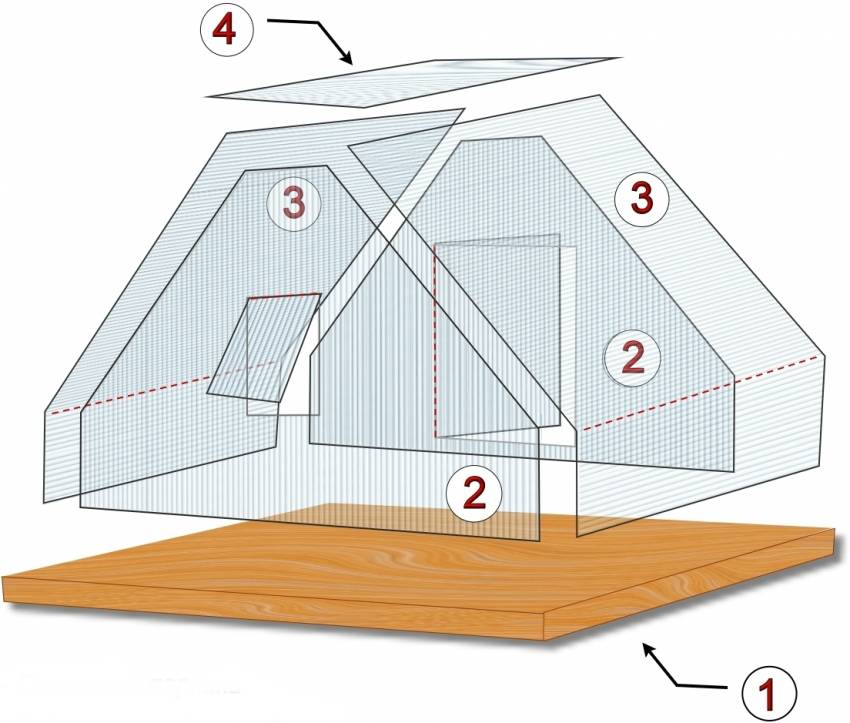 Схема мини парника из листового поликарбоната (1 — основание парника; 2 — задняя и передняя стенки; 3 — скаты крыши; 4 — верх крыши)