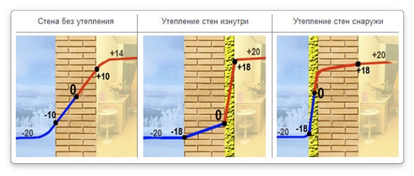Второй крупный недостаток этого решения: если утеплить стену изнутри, то точка росы – условия образования конденсата, окажется внутри помещения, а не снаружи. Третий недостаток – теплоизоляция отнимает не менее 15 см внутреннего пространства.
