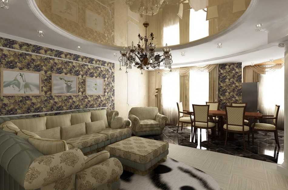Многоуровневые потолки, помогут грамотно разграничить жилое пространство. Красивые люстры в каждой части гостиной будут равномерно заполнять помещение мягким светом;