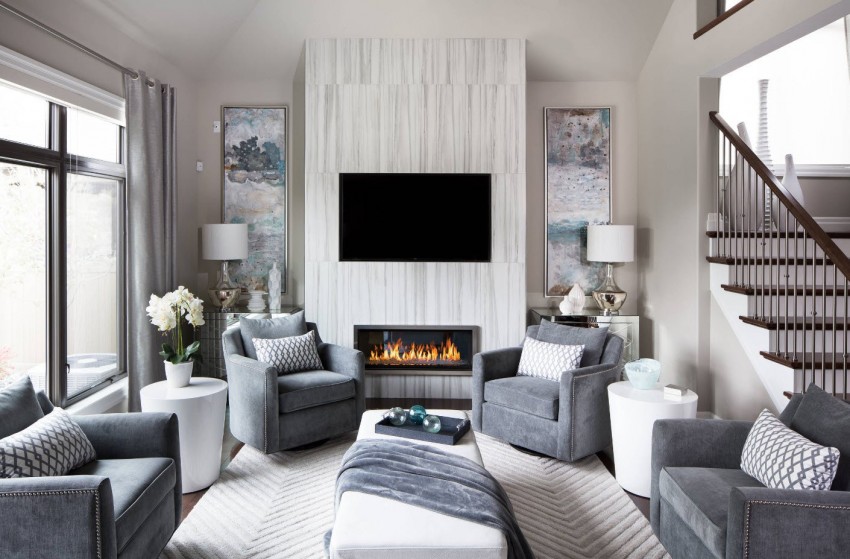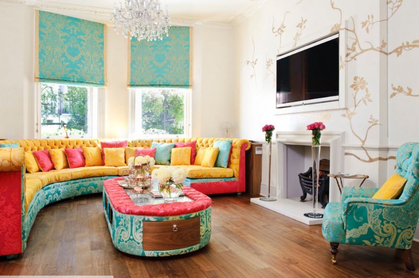 При использовании в интерьере различных цветов и оттенков, мы расставляем акценты на тех частях комнаты, на которые хотим обратить внимание. Тем самым мы имеем возможность отвлечь взгляды гостей от каких-либо недостатков помещения, например, неровные стены или дефекты на потолке, и перевести фокус на красивый камин или стеллаж, оформленные яркими обоями