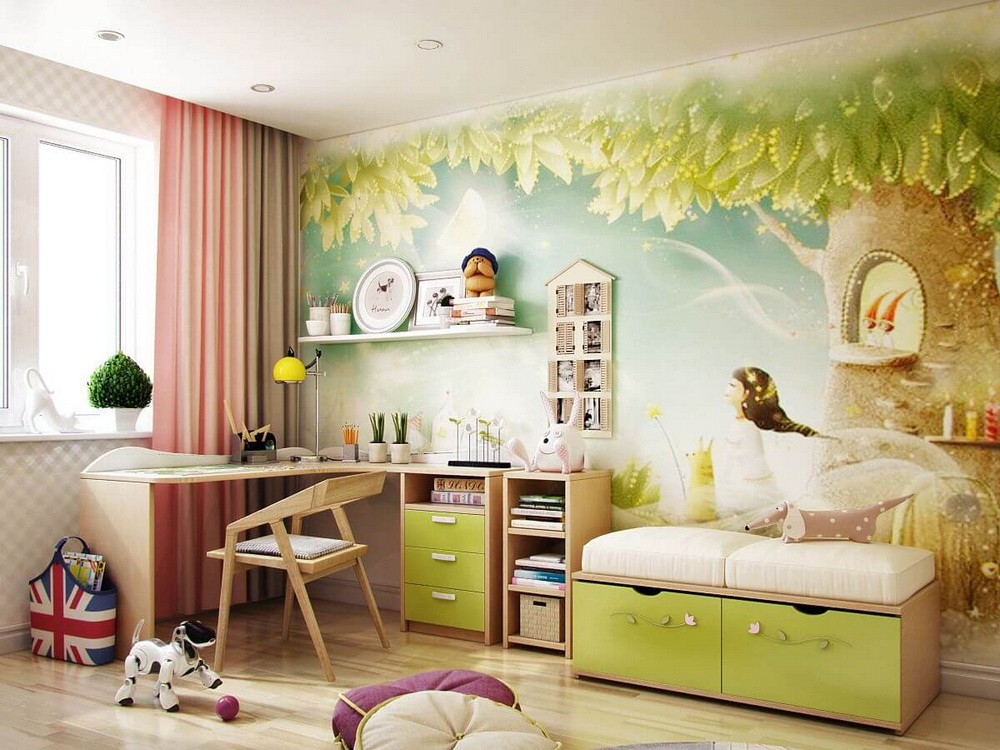 С детской комнате можно смело комбинировать яркие и сочные оттенки. Для малышей можно использовать лоскутную технику с цветами и рисунками, соответствующими полу. Так же удачно будет смотреться одна из стен отделанная фотообоями или обоями с рисунками.
