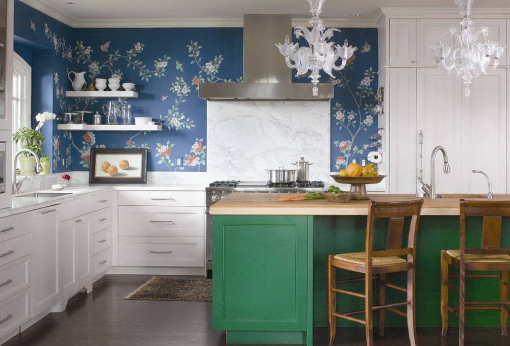 В кухне практичнее комбинировать обои над обеденной зоной и плитку в зоне готовки. Цвета могут перекликаться между собой.