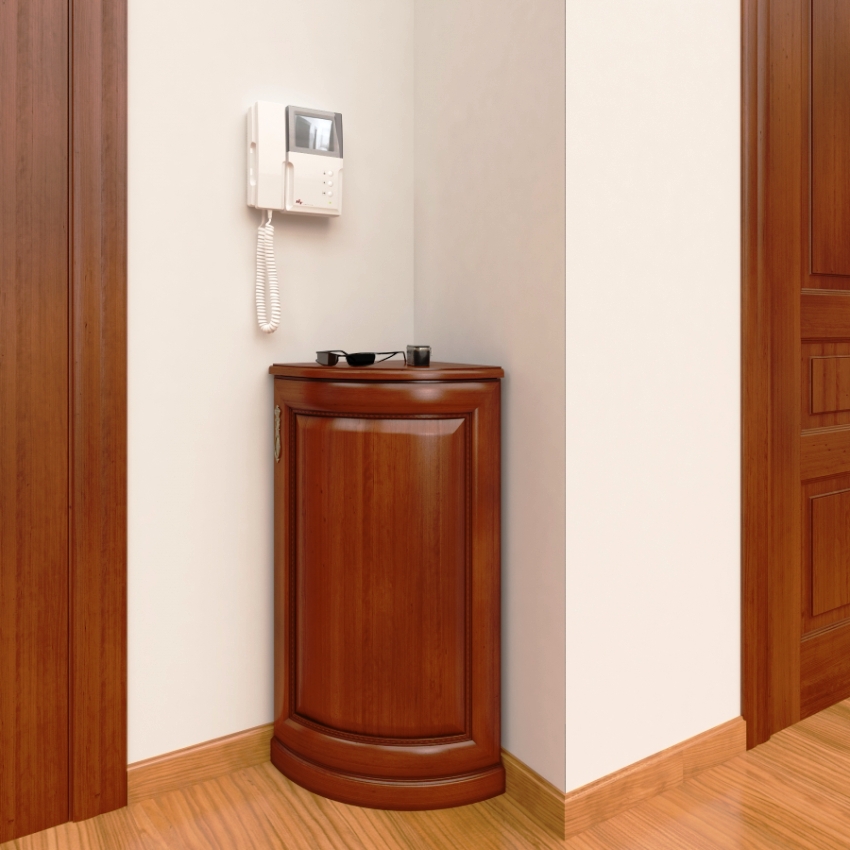 Угловой комод – один из самых востребованных «продуктов» мебели для прихожей. Такая форма тумбы вмещает в 2,5 раза больше вещей, чем такого же размера прямоугольный шкафчик. Правда, угловой комод имеет главный принцип его использования – он может быть размещен только в квадратной прихожей. Даже длинный вытянутый коридор не сможет разместить угловой комод, поскольку ни по стилю, ни по расположению он не впишется гармонично в помещение.