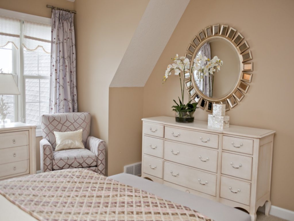 Красивый комод скромных размеров прекрасно дополнит интерьер спальни с отдельно стоящим шкафом или со шкафом-купе. Над ним можно навесить зеркало даже при наличии зеркальной фасадной поверхности шкафа-купе – они имеют разное функциональное назначение.
