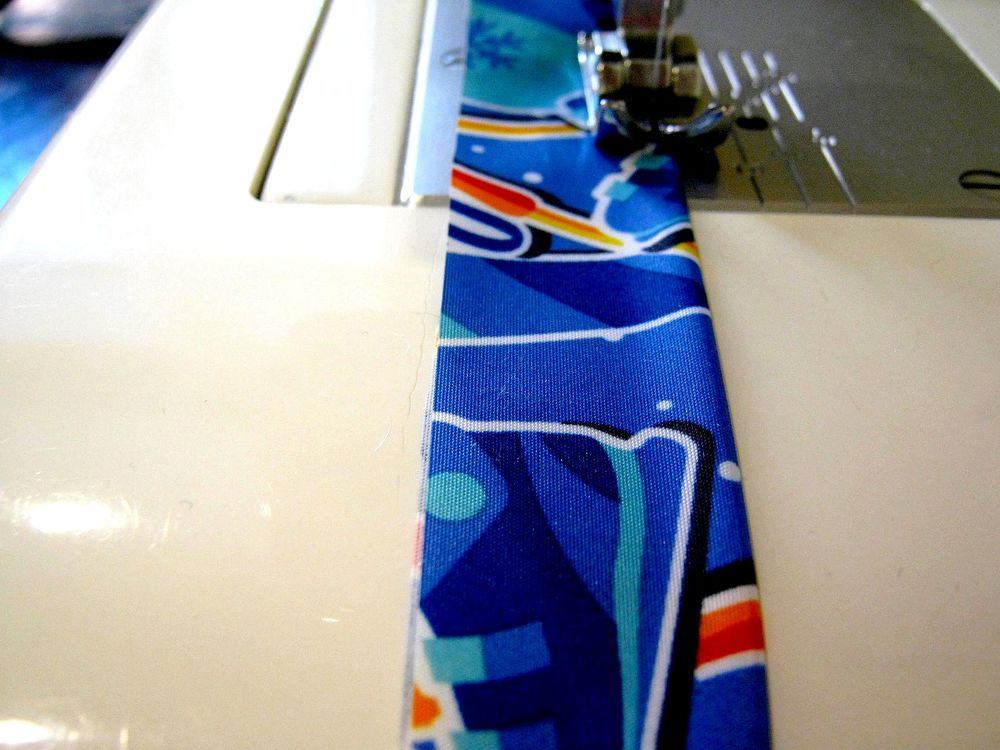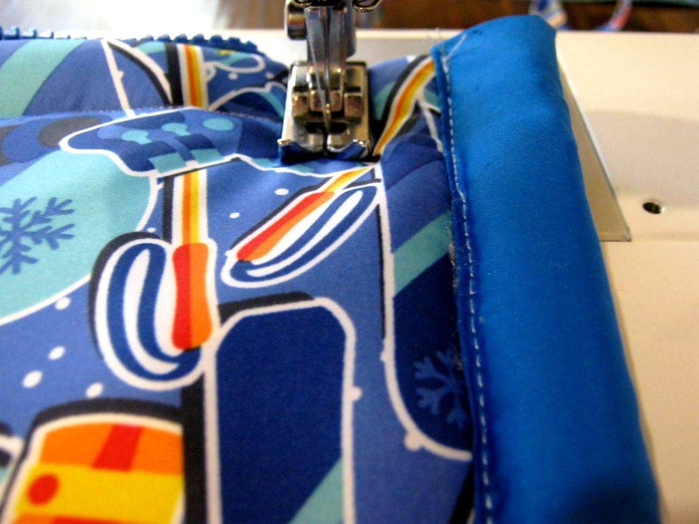 Дополнительно прошиваем конверт с лицевой стороны в области молнии, чтобы наполнитель не мешал ей застегиваться. Затем приступаем к окантовке верхней части изделия. Край подготовленной ткани приметываем к внутренней части, отворачиваем на лицевую сторону, подгибаем внутрь и прошиваем.