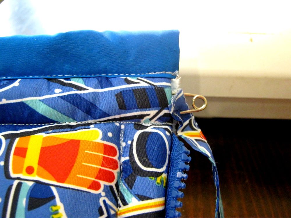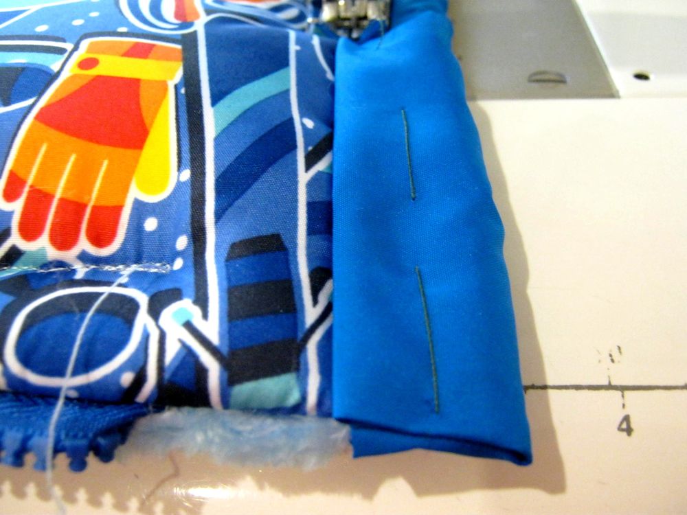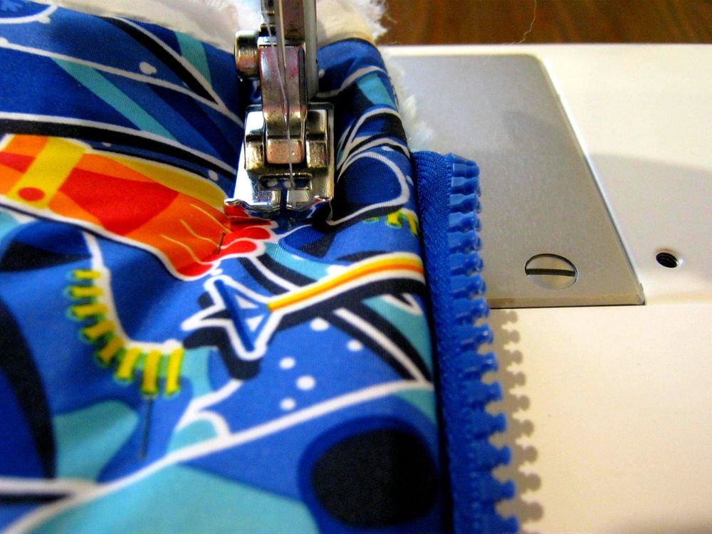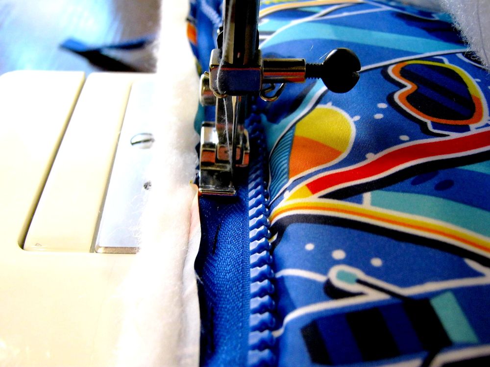 Затем между внутренним и внешним слоями вшиваем молнию, подогнув края вовнутрь.