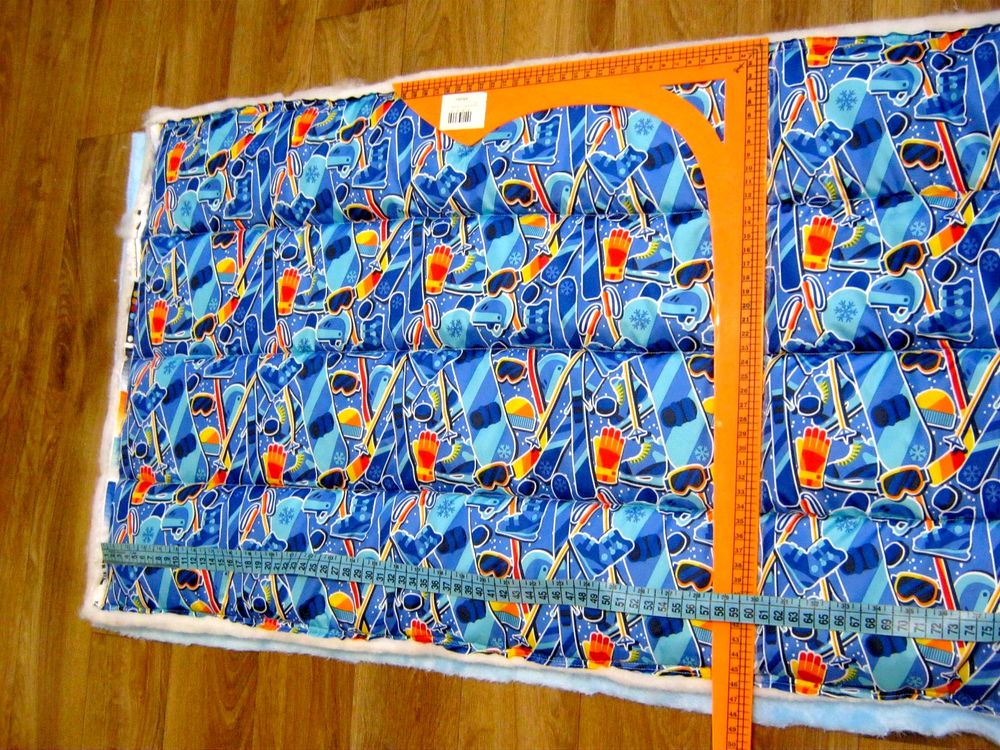 Свободные концы одеяла складываются вместе. Намечают, как пришить третью молнию, разъемную, превращающую сверток в мешок.