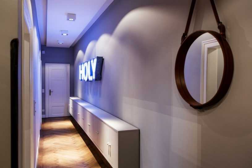 - Визуально распахнуть стены в узкой прихожей поможет освещение, направленное в одну сторону.