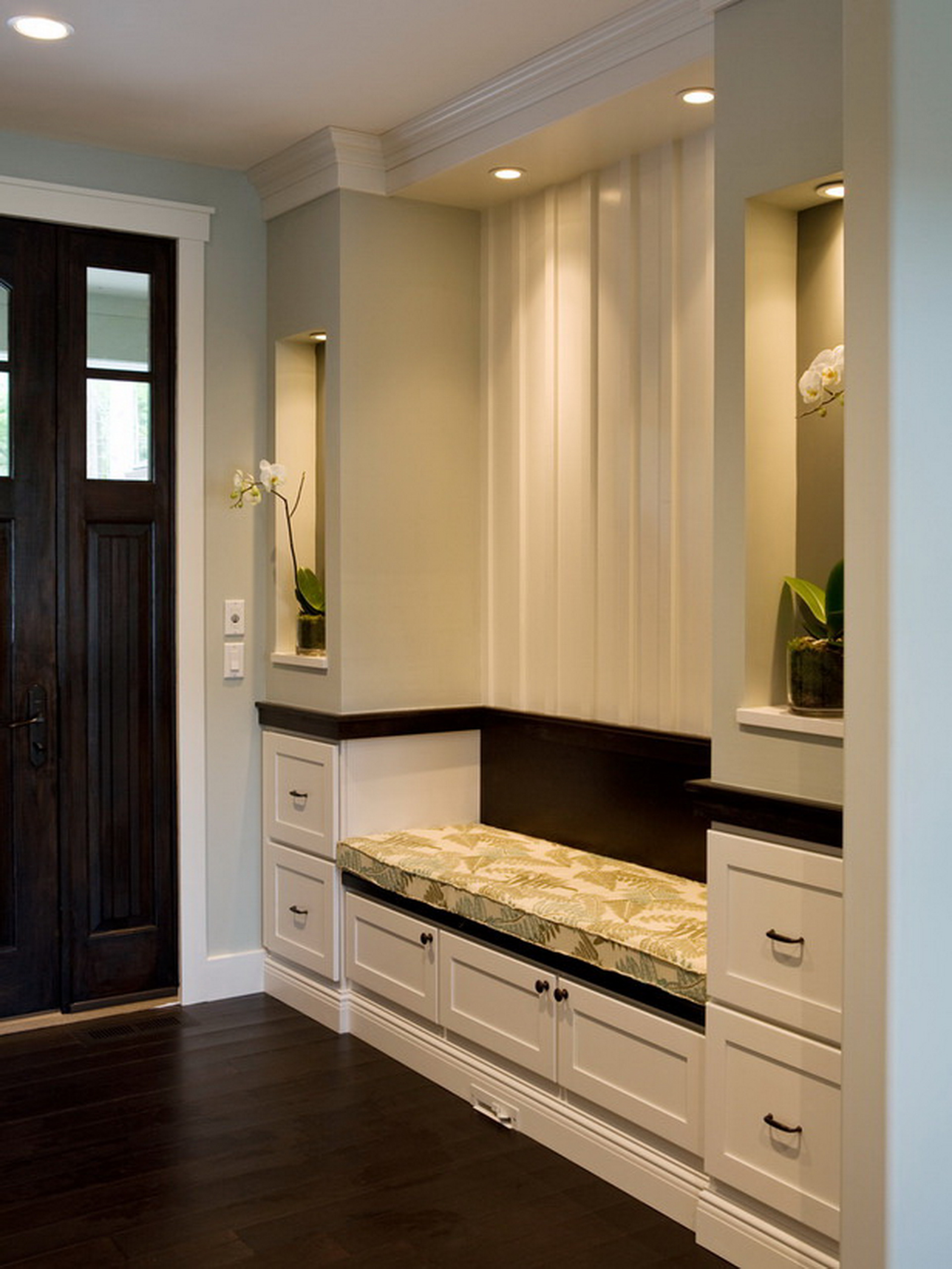 - Зонируйте пространство, выделив определенное место для размещения обуви и одежды, при этом оставьте площадь для холла.