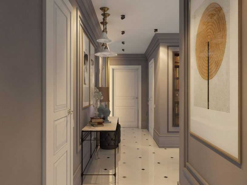 Правильно расположенные светильники по центру длинных стен тоже создадут световое затемнение у торцов. Фото дизайна прихожей для узкого коридора помогут правильно сориентироваться с оформлением и подобрать нужный вариант.