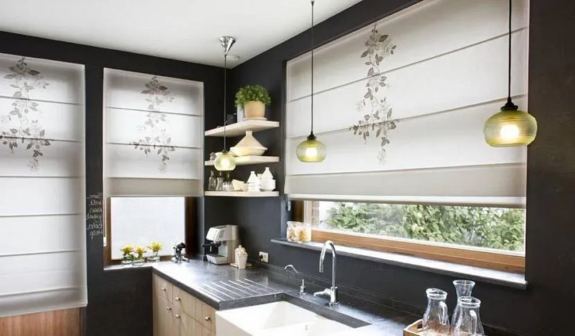 Этот вариант занавесок удобен в использовании, он не усложняет дизайн кухни, не утяжеляет ее. При необходимости римские шторы можно убрать, сохранив естественное освещение на кухне.