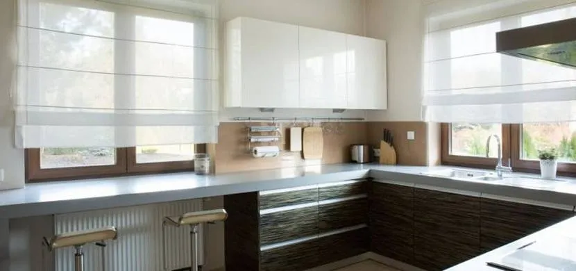 Римские шторы подходят для дизайна просторной кухни, сохраняя ощущение свободного пространства и уюта в помещении.