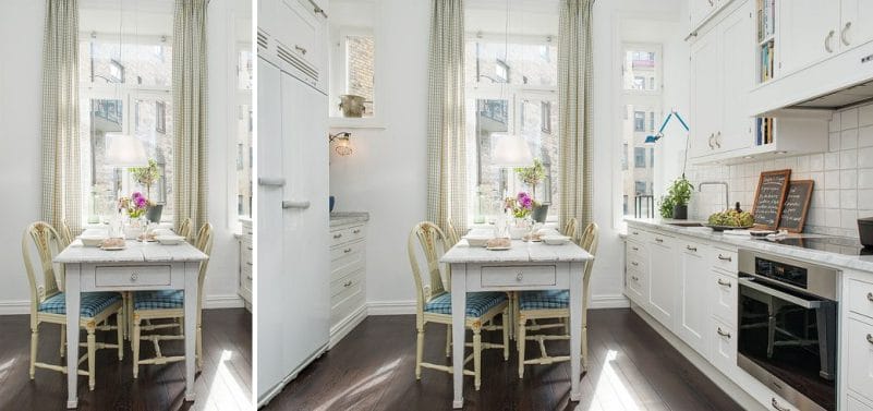 В отделке и мебели маленькой кухни лучше всего использовать светлые и пастельные тона — белый, бежевый, кремовый, светло-серый, а с идеями оформления дизайна можно увидеть на фото. Темный пол зрительно уменьшит комнату в квартире и сузит стены. Дизайн, оформленный в мягких тонах, добавит света и свободы. По возможности цвет мебели и стен должны совпадать – пространство зрительно расширяется, визуально стирая границы. Соответственно, не рекомендуется вносить в интерьер темные и контрастные цвета. Яркие цвета целесообразно использовать как акцент, элемент отделки. Таким образом, можно выделить мебельные фасады на фоне светлой столешницы, как продемонстрировано на фото. Но не стоит использовать более двух контрастных оттенков при отделке, создавая дизайн.