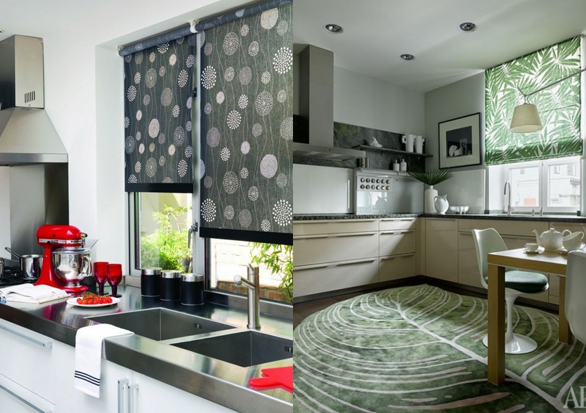 Укороченные шторы с принтом, поверхности столешниц, полки для размещения посуды и т.д. – контрастирующие элементы кухонного интерьера