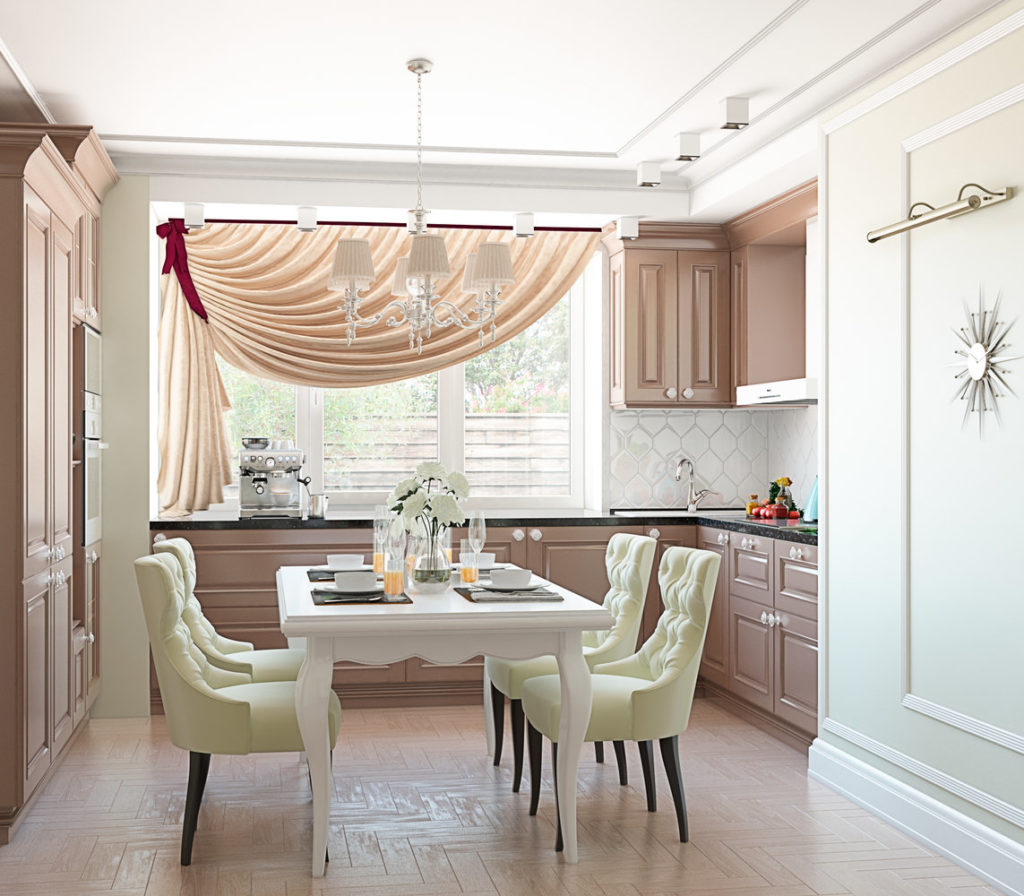 Правильный выбор занавесок подчеркнет кухонный дизайн, оттенок штор выбирайте на один, два тона темнее или светлее, цвета обоев или кафеля. Текстиль может повторять цветовые оттенки кухонной мебели, современные кухонные гарнитуры часто изготавливают из яркого пластика. Короткие шторы, с элементами декора того же цвета, что и гарнитур особенно нарядно смотрятся. Не стоит выбирать яркие шторы, если мебель на кухне темная. Эффектно выглядят шторы в тон декоративным подушкам или скатерти. Бежевый, молочный, белый цвет занавесок подойдет под любой кухонный интерьер.