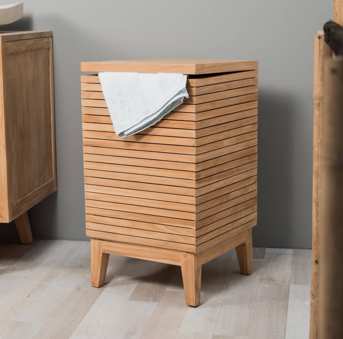 Дерево. Деревянные ящички для грязного белья удобны и экологичны. Они хороши тем, что не вызывают аллергии, не впитывают влагу, не дают развиваться грибку, плесени и не подвержены гниению. Однако, как и в случае с плетеными корзинами, все эти положительные особенности реальны только в том случае, если при создании корзины дерево было обработано особым влагоотталкивающим средством. Как и другие предметы, выполненные из натурального сырья, деревянные аксессуары привносят в атмосферу ванной комнату нотку уюта. Они хорошо вписываются в интерьеры, оформленные в духе прованса, классики, модерна.