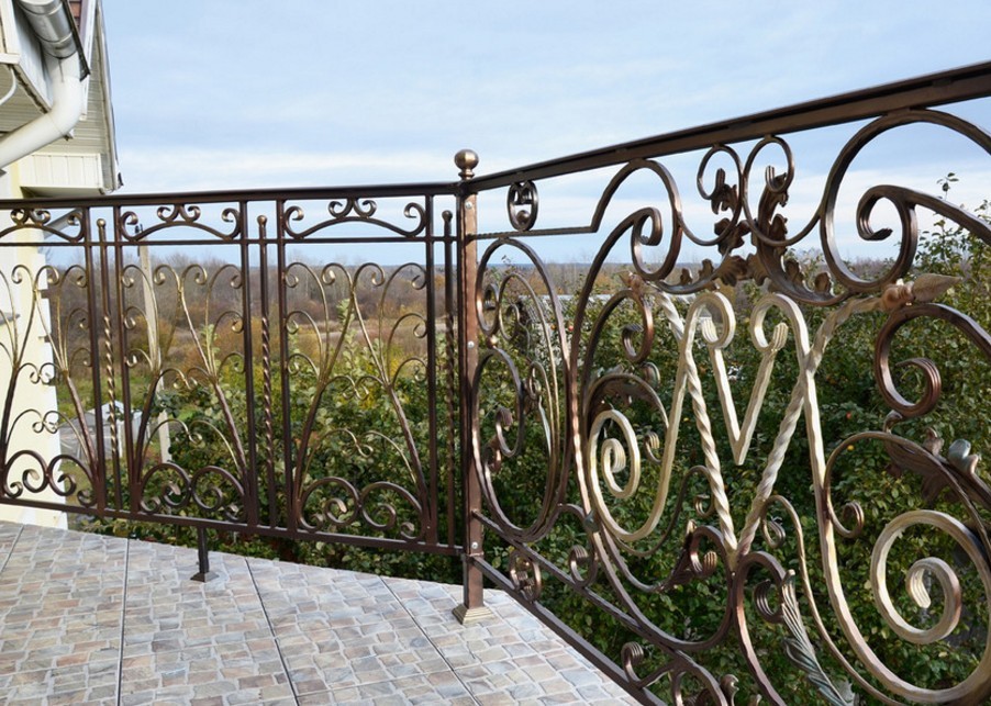 Популярным декоративным приемом выступает патинирование – искусственное состаривание под золото, серебро, медь, бронзу и т.д. Эффектной по дизайну техникой является покрытие под золото. В результате в местах обработки кованый балкон имеет приятный коричнево-золотистый цвет.