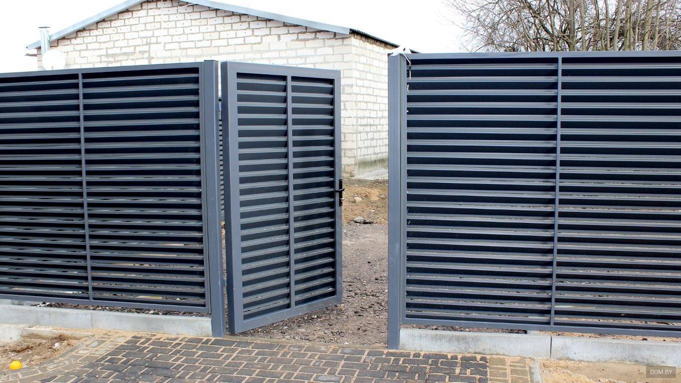 - заборы жалюзи, у которых доски располагают под углом к плоскости забора, оставляя между ними зазор;