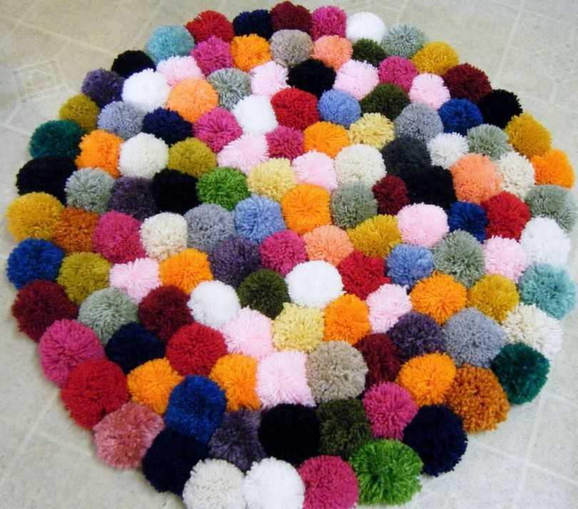Одно из самых оригинальных изделий такого рода собирают из помпонов. Обязательно используют наполнитель – сентипон или поролон, поэтому ковер получается мягким и теплым, очень уютным. Самый подходящий материал – натуральный трикотаж.