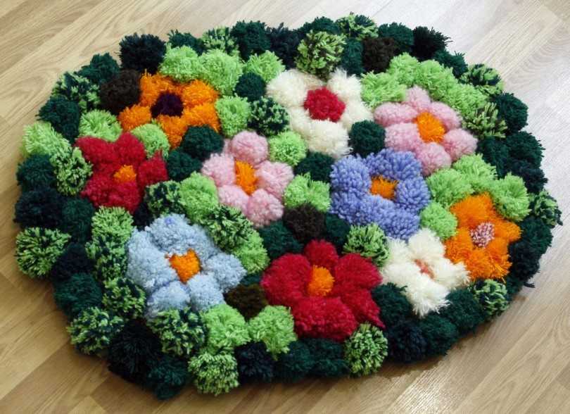 Если использовать помпоны разного размера и цветов, из разных ниток — гладких, колючих, мохнатых — можно сделать «развивающий» коврик для малышей. Детям надо развивать тактильные навыки и этот коврик поможет.