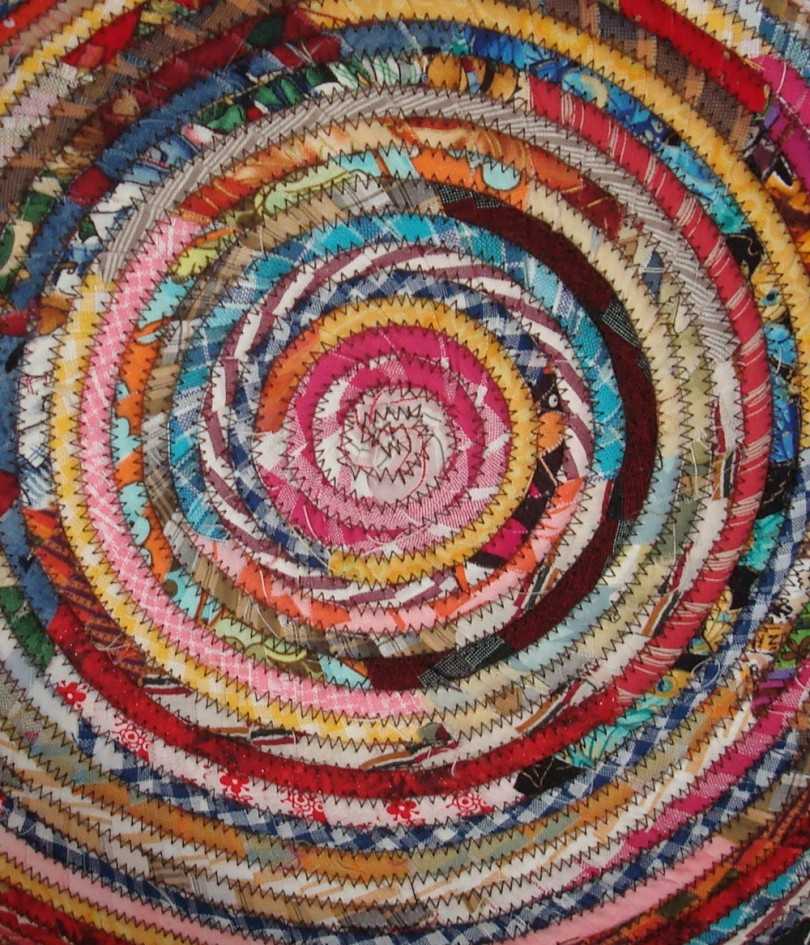 Дальше готовим «пряжу» из старых футболок, вещей. Но делаем ее потоньше чем для косичек — слишком толстую тяжело вязать. Дальше можно идти несколькими путями — вязать как обычную салфетку или обвязывать какой-нибудь шнур. При использовании пряжи (любой) без шнура, начало может быть различным. Можно, например, связать цепочку из 8-10 воздушных петель, замкнуть ее в кольцо и потом, в каждую из петелек провязывать столбики. С накидом или без — это как вам нравится или какие вы умеете. Есть более интересный вариант, который позволяет сделать серединку плотной — без дырочки (что может получиться в предыдущем варианте).
