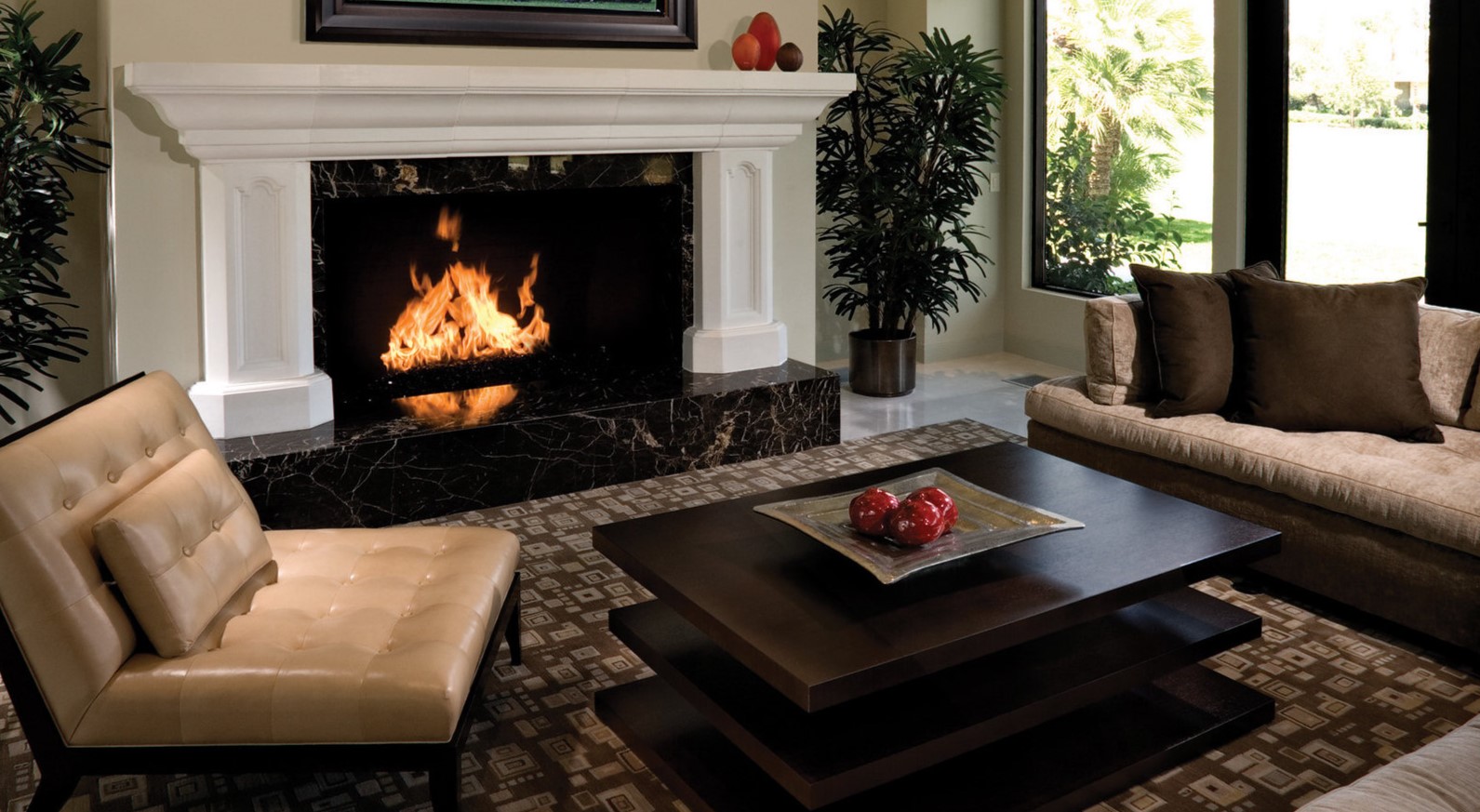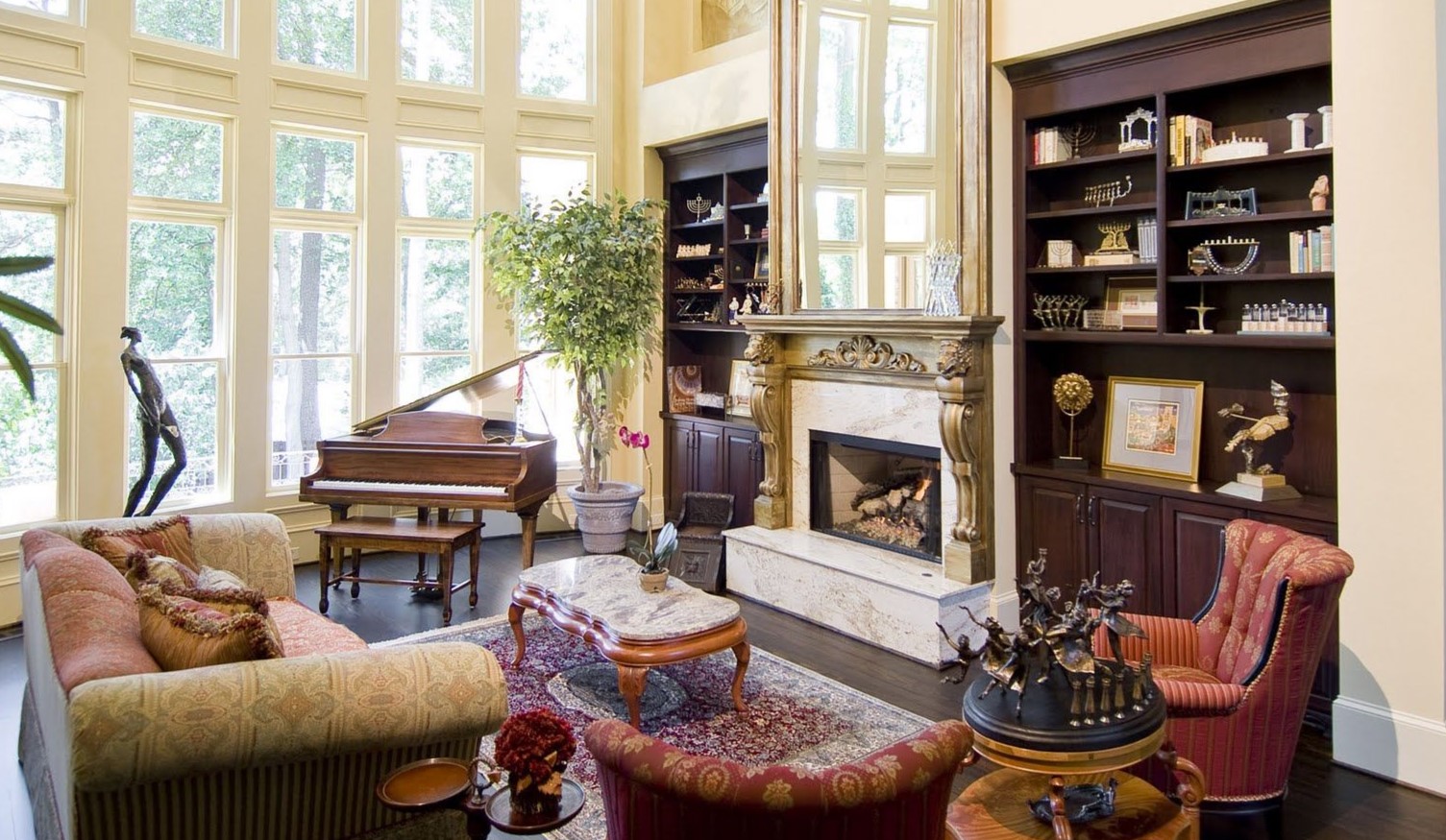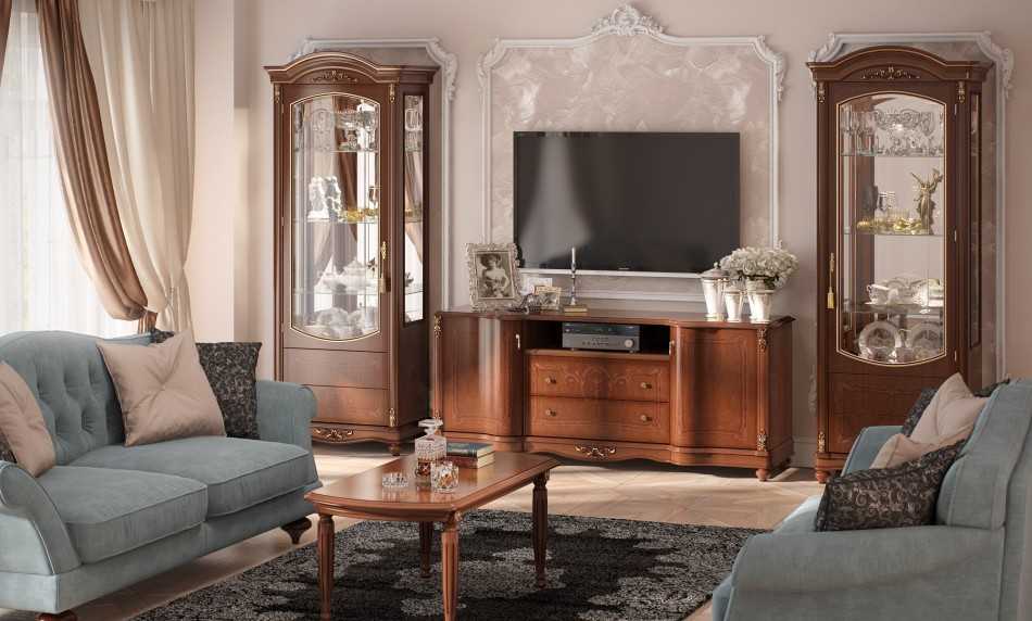 Красивая мебель в интерьере гостиной с резными элементами и пилястрами