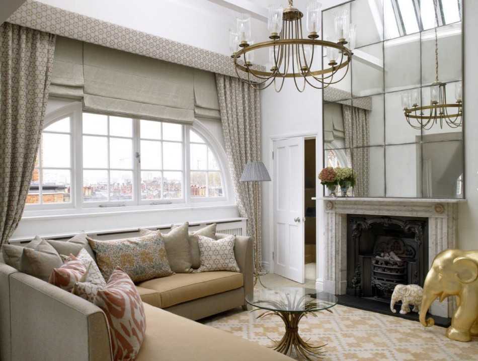 Современные тенденции практически не коснулись зонирования: по-прежнему в моде арки в гостиной, стеллажи, легкие перегородки, шторы, трансформируемые решения, светильники и многоуровневые конструкции. Меняется лишь дизайн таковых. Если в классическом интерьере гардины будут с драпировками и ламбрекенами, то в современном зале это будут простые ниспадающие полотна на металлическом или потолочном пластиковом карнизе.