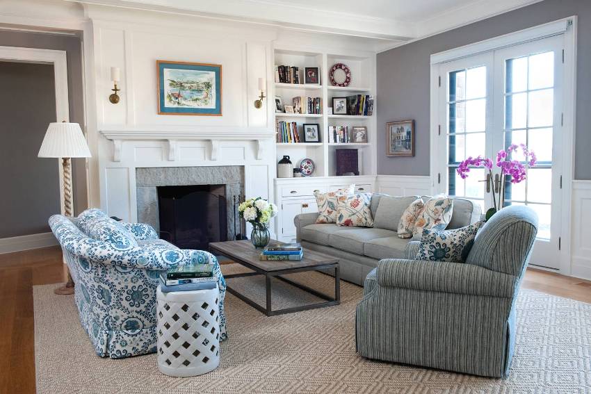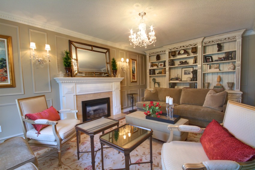 В комнате стоит установить удобный угловой или прямой диван, а перед ним – стильный журнальный столик. Также в гостиной будет уместен декоративный камин.