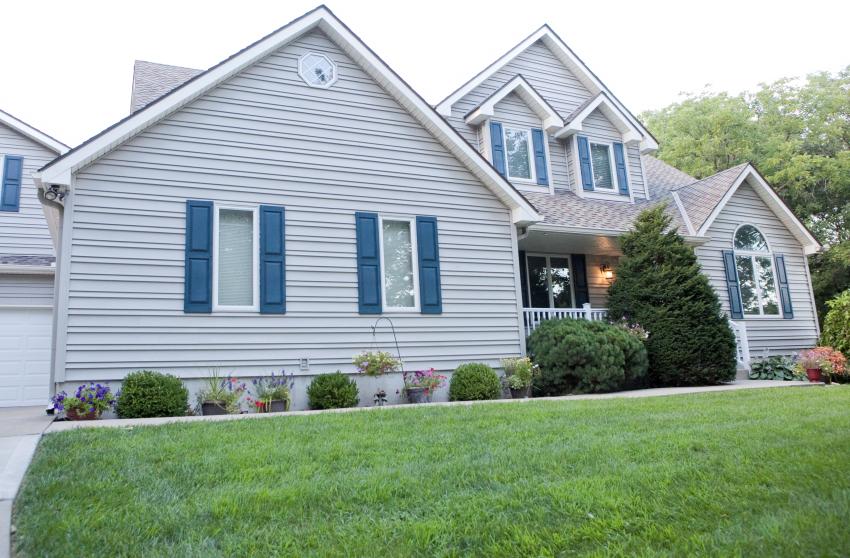 Дом обшит виниловым сайдингом синего цвета