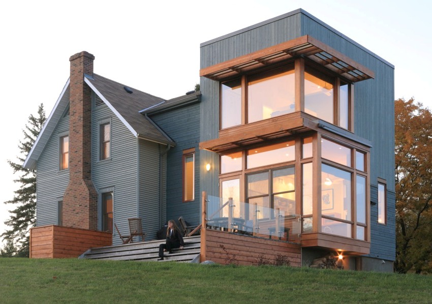 Наружное оформление подобного стиля приемлет остеклённые террасы и деревянную обшивку
