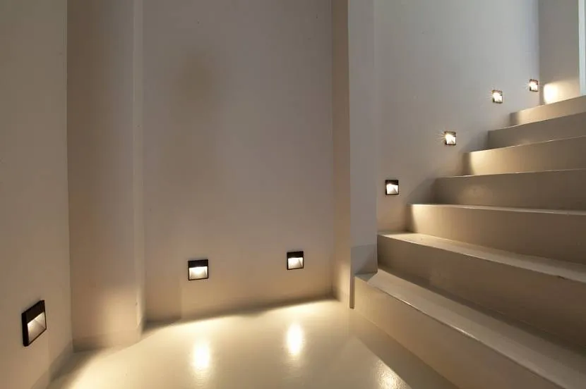 Освещение ступенек для второго этажа можно выполнять с помощью специально предназначенных светильников. Их устанавливают в ниши. Включают регулярно в ночное время. Как вариант, настраивают автоматический запуск и отключение подсветки.