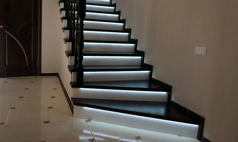 Конструкция с забежными ступенями. Выполнена из дерева. Отличным вариантом освещения служит подсветка, которая располагается под каждым спуском. Ее стараются организовывать с помощью светодиодной ленты, чтобы слегка подсветить сооружение. Такое оформление позволяет удобно пользоваться лестницей в ночное время. Запускается освещение с помощью прилегающих выключателей.