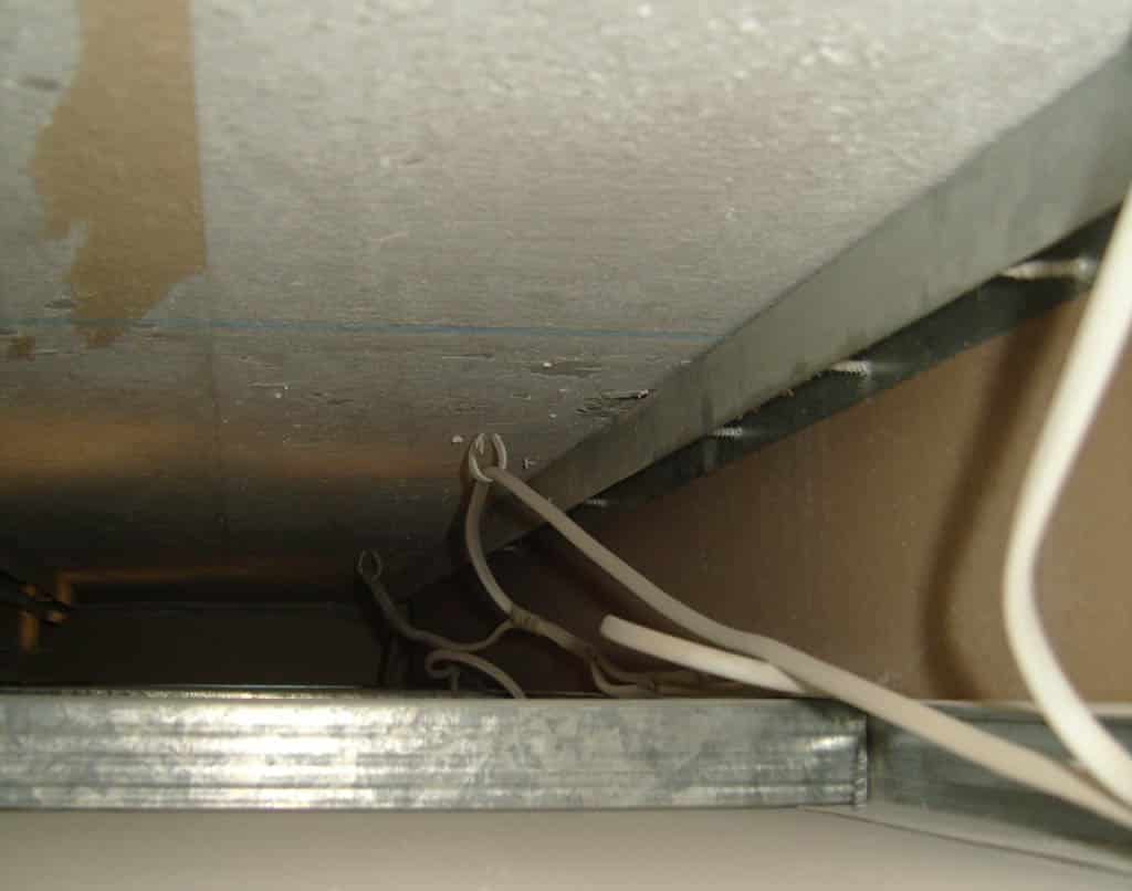 Проводка закрепляется таким образом, чтобы в последующем она не мешала работе по установке гипсокартонного короба, однако после обшивки к ней можно было бы иметь доступ. Этого можно достичь посредством крепления проводов к профилю при помощи жгутов.