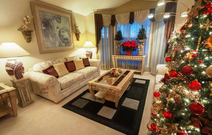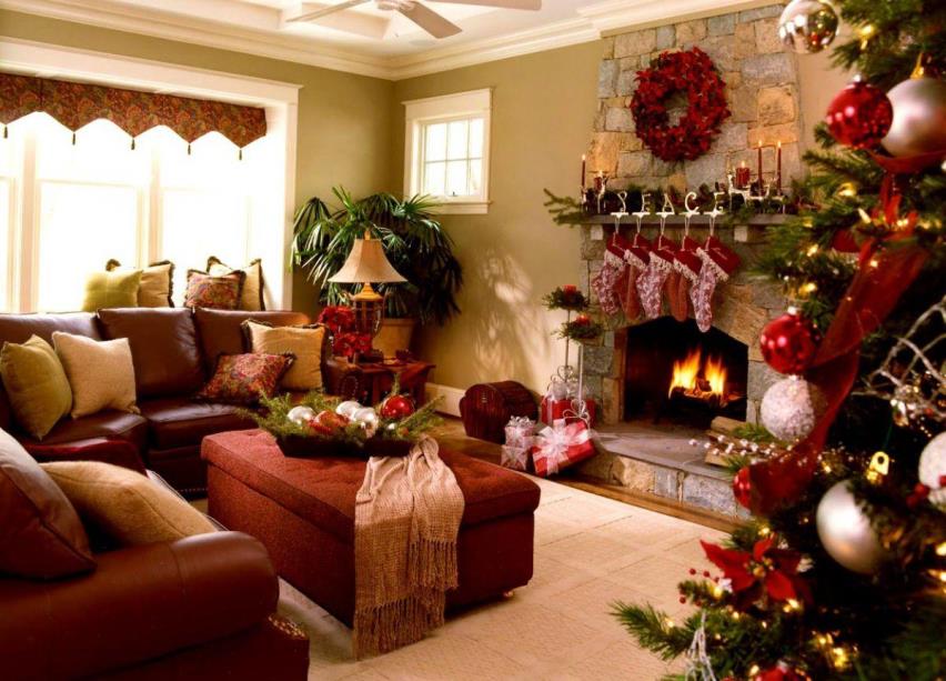 Одним из основных цветов, характерных для новогоднего дизайна, считают красный. Он сочетается с зеленой хвоей, является символом Дедушки Мороза, так что в вашей гостиной он точно вызовет нужные ассоциации. Но это достаточно яркий оттенок, так что с ним следует быть осторожнее.