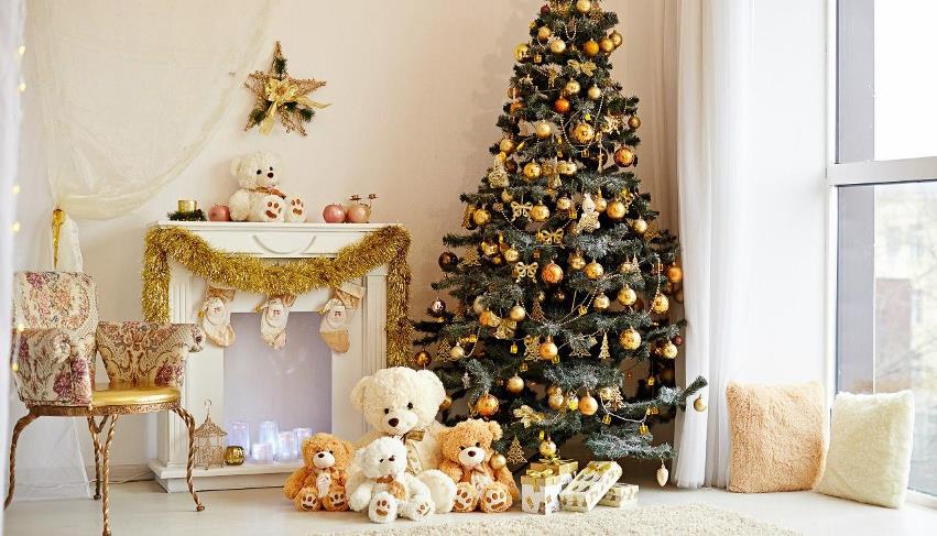 Второй способ, как оформить зал в золотом цвете на Новый год. Такое оформление выглядит более мягким, спокойным – большую роль играют игрушки, подушки, мягкая обивка.