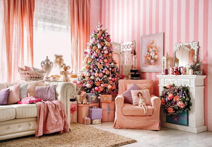 Легкие розовые тона тоже подойдут для дизайна комнаты на Новый год. Подберите несколько вариантов елочных украшений, запаситесь бантами и лентами. Можно даже использовать элементы флористики, как на фото. Получится нежный, спокойный дизайн – как раз для уютного новогоднего вечера.