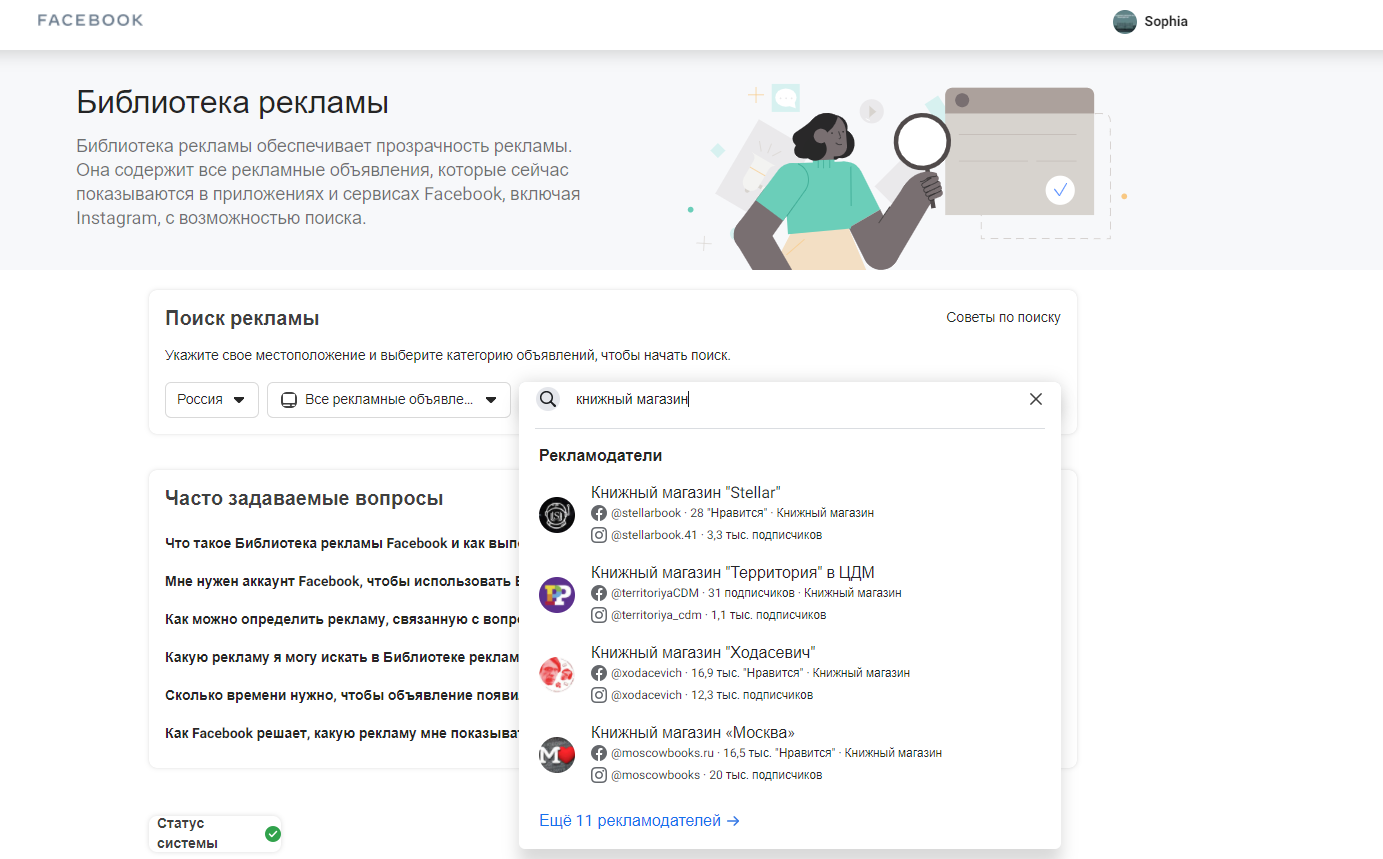 Чтобы найти рекламу, перейдите в Библиотеку рекламы в Facebook и укажите параметры поиска: