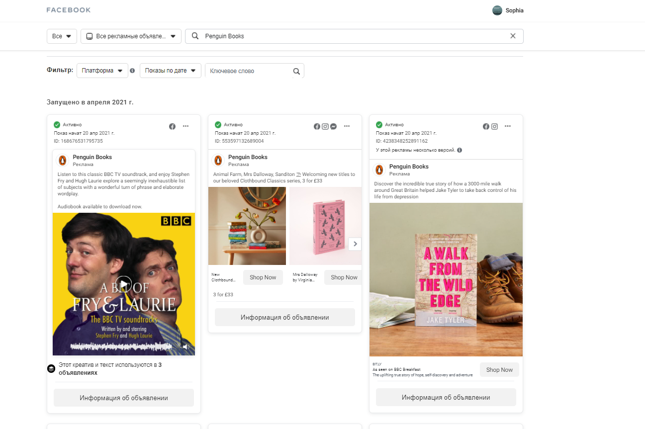 Можно отфильтровать рекламу по дате запуска, платформе (Facebook, Instagram, Audience Network, Messenger), а также ввести дополнительные ключевые слова для поиска нужных объявлений. А нажав под объявлением кнопку «Информация об объявлении» вы увидите дополнительные сведения о рекламе, например, другие версии этой рекламы, если они есть.