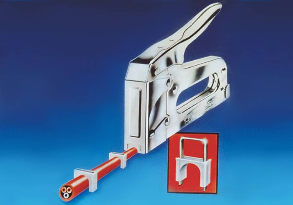 Для механических пистолетов также используют небольшие пластиковые скобы, которые крепятся гвоздем. Подобный тип крепежа популярен при прокладке кабелей сети интернет, кабельного телевидения, оптоволоконных систем.
