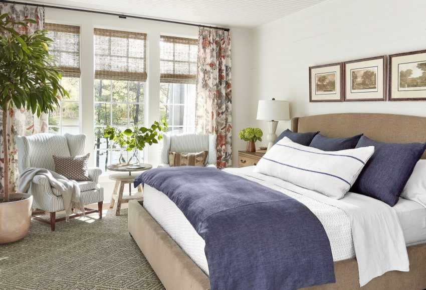Интересный дизайн получится, если в белой спальне поставить темно-синюю мягкую кровать с высоким, обитым тканью изголовьем, деревянные прикроватные тумбочки небольших размеров, а также неброское плетеное кресло из лозы, дополненное мягкой подкладкой на сидении. Последнее можно поставить в углу или чуть дальше одной из прикроватных тумбочек.