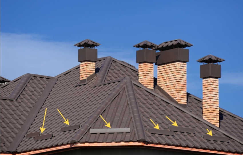 - Планки примыканий. Эти изделия обрамляют места стыков черепицы со всеми важными конструкциями, такими как печные трубы и вентиляционные трубы.