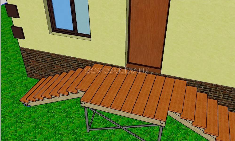 На даче чаще всего встречается самый простой вариант, где высота лестницы чуть выше, чем высота фундамента. Наличие или отсутствие перил – дело удобства и вкуса.
