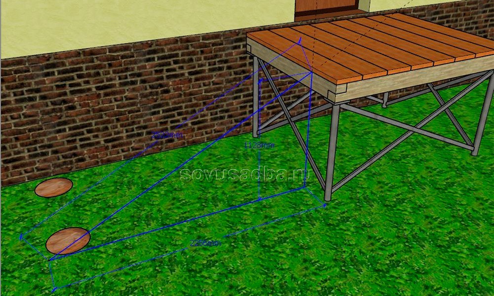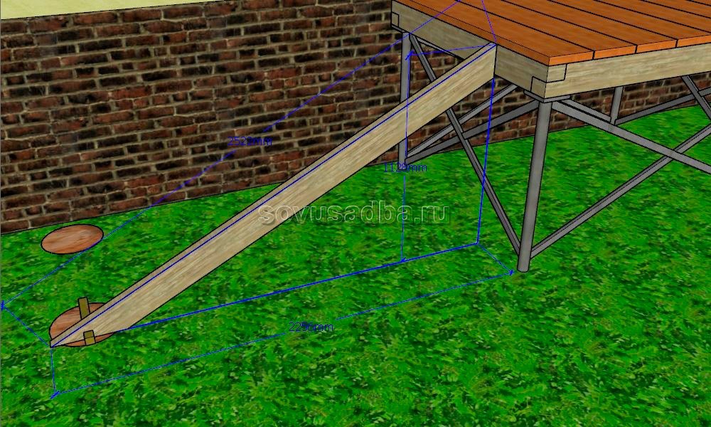 Для правильного расчёта вам необходимо знать расстояние от рабочей плоскости каркаса площадки, до земли. Только не перепутайте, нужна плоскость именно несущей конструкции, без облицовки, ведь для ступеней последняя также понадобится.