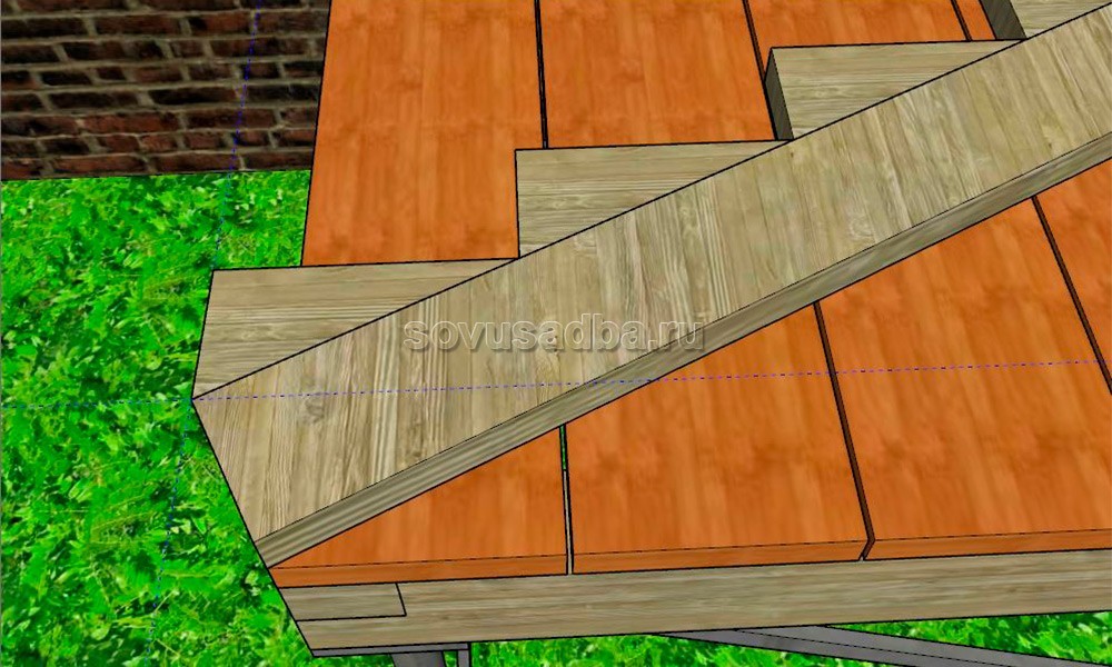Так верхний торец косоура спиливается под прямым углом к плоскости проступи.