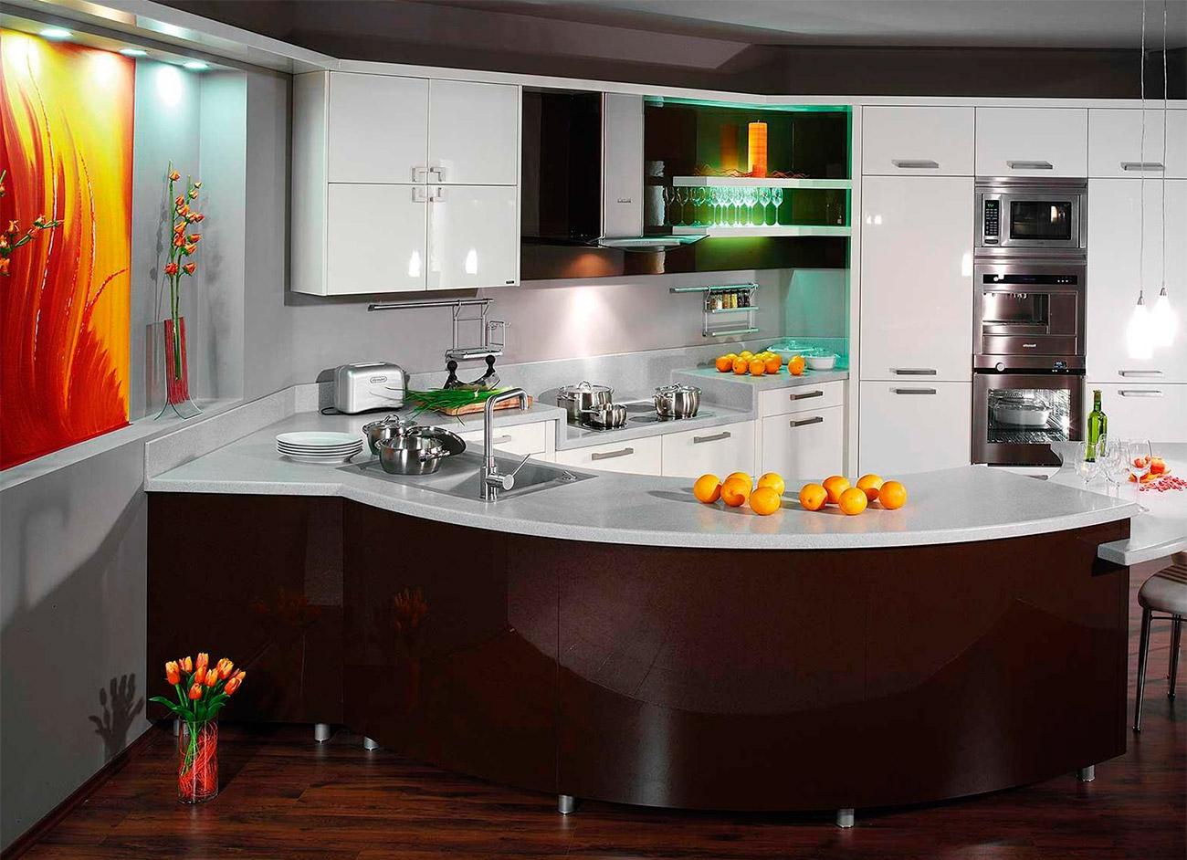 При оснащении центра кухни обеденным столом и барной стойкой в зону отдыха устанавливают угловой диван полукруглой формы.