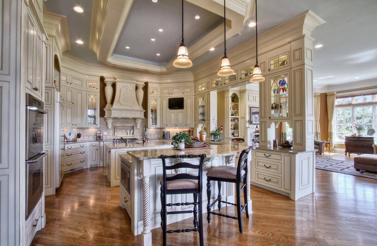 Дизайн в классическом стиле отличается меблировкой из натуральных материалов и деревянным кухонным гарнитуром, за фасадами которого скрывается вся современная техника. Комната оформляется в пастельных тонах и украшается лепниной, позолоченными, бронзовыми элементами и другими роскошными деталями.