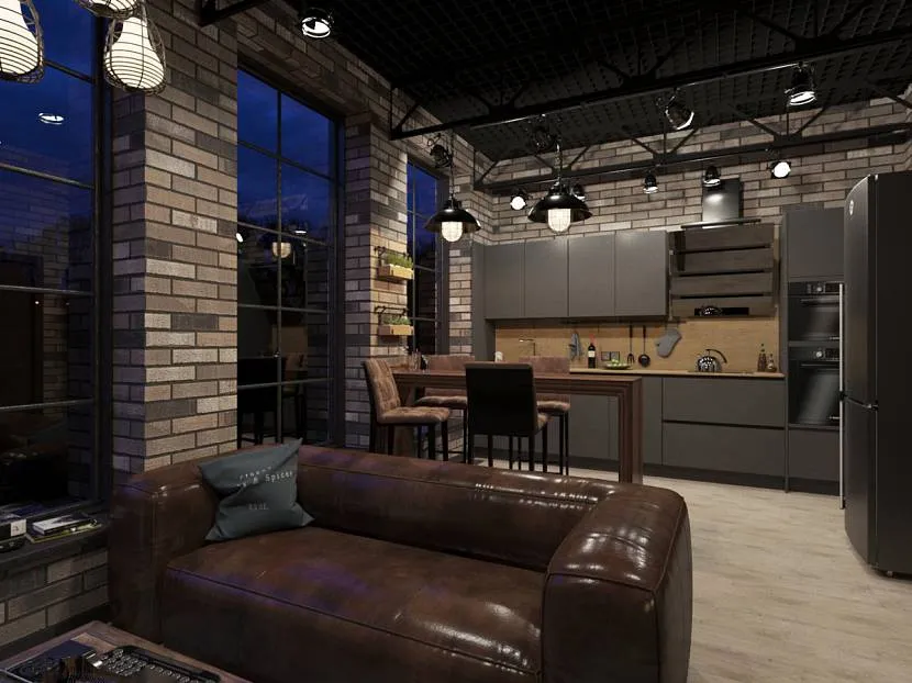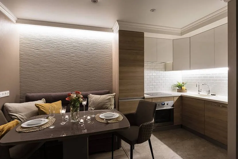 Освещение. Идеально, если каждая зона будет иметь собственную подсветку. В обеденной зоне вешают люстру, подходящую к общему стилю помещения. В месте отдыха – подойдет бра. А рабочую зону выделяют точечными светильниками. Чтобы подчеркнуть единство комнаты, используют подвесной потолок со встроенными светильниками по периметру.