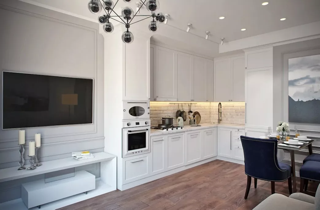 Для обустройства зоны кухни отлично подойдет небольшой гарнитур со встроенной бытовой техникой в комбинации с барной стойкой, а для гостиной – вместительный угловой диван, журнальный столик, консоль или телевизионная стенка.