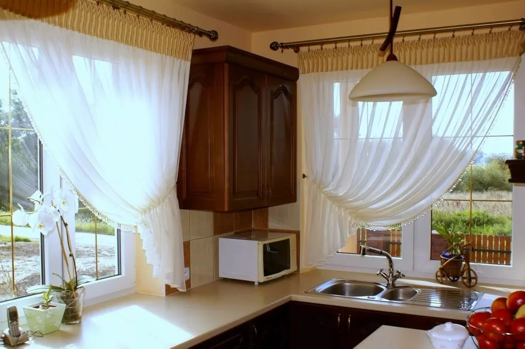 Для наполнения кухонного пространства достаточным количеством естественного света исключают использование плотных гардин. Окна украшают только легкой занавеской.