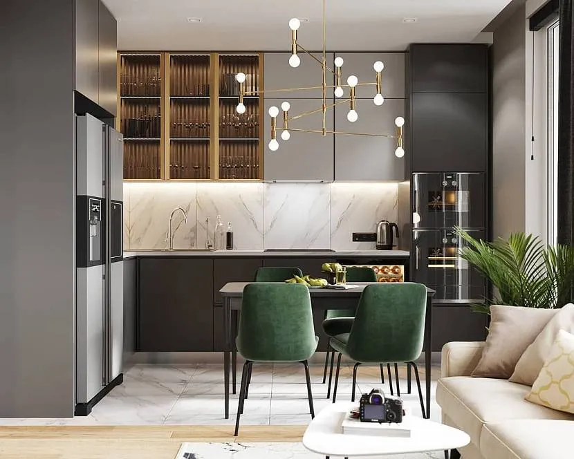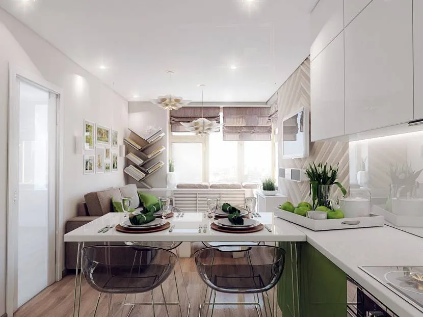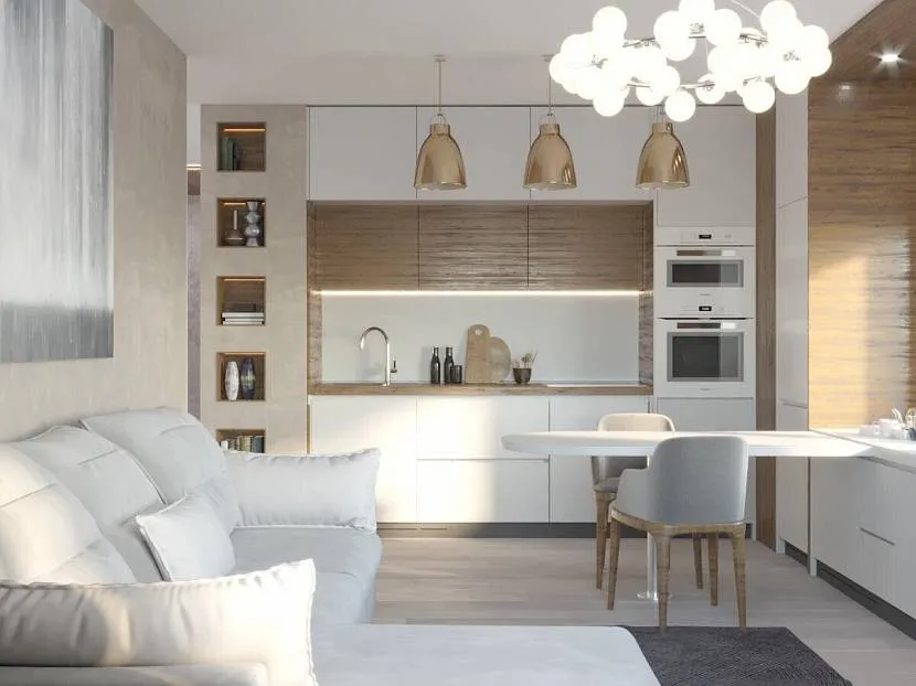 - Желательно не использовать массивные элементы обстановки как на кухне, так и в гостиной. Габаритный холодильник, большой шкаф или диван займут много пространства и значительно утяжелят интерьер.